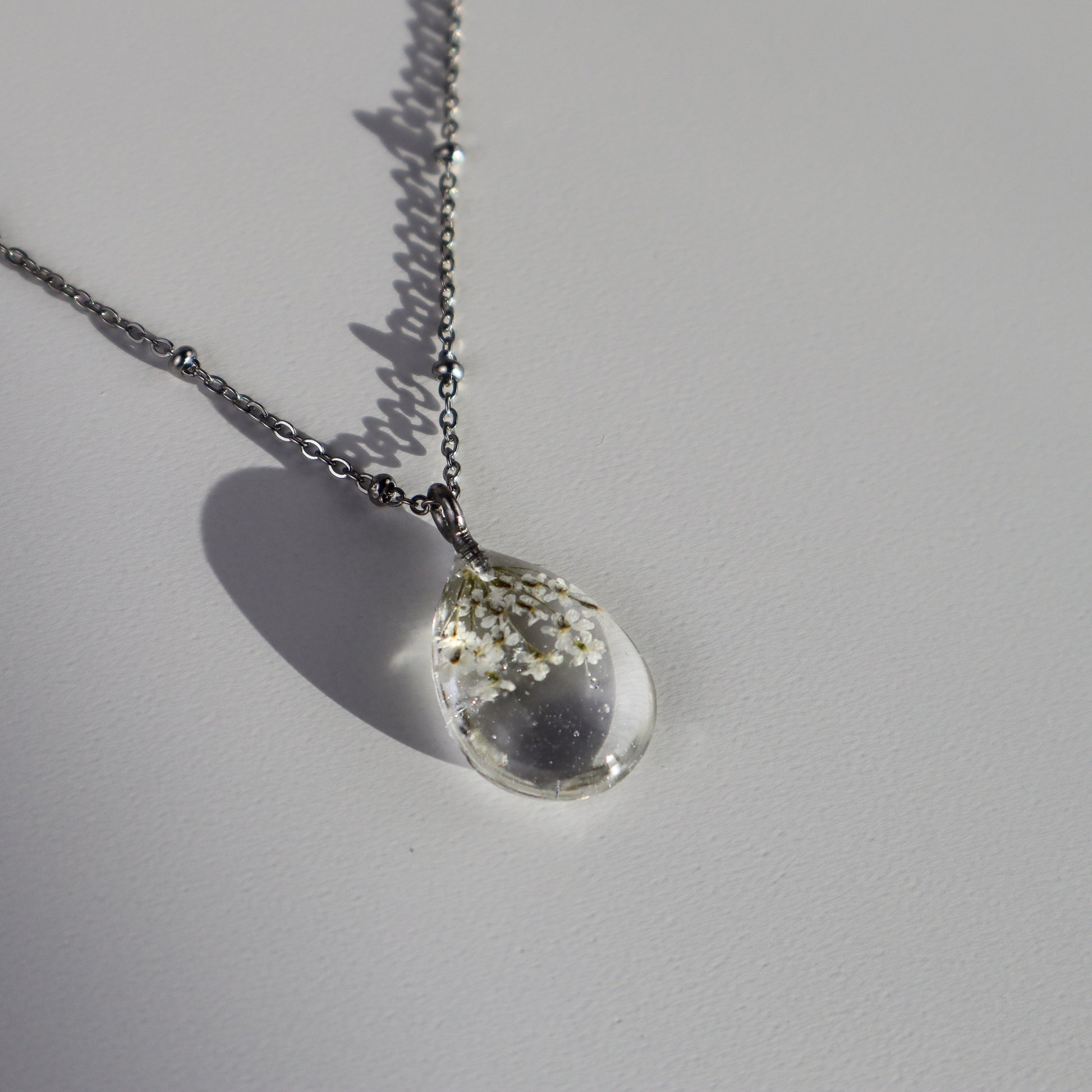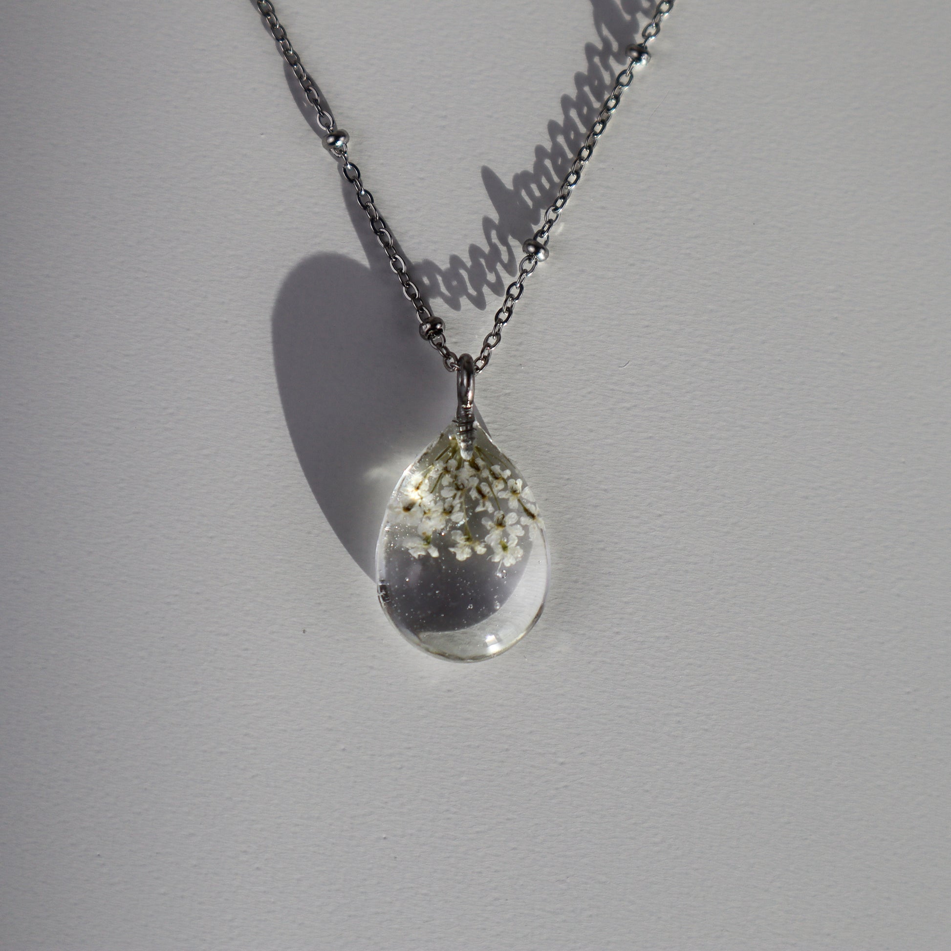 Each pendant is infused with colors inspired by real flowers in nature, adorned with delicate Lace Flowers (Queen Anne’s Lace) that bring a timeless elegance.
