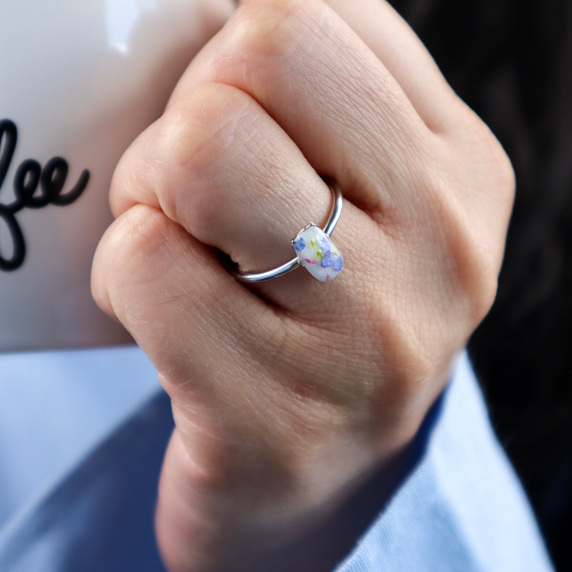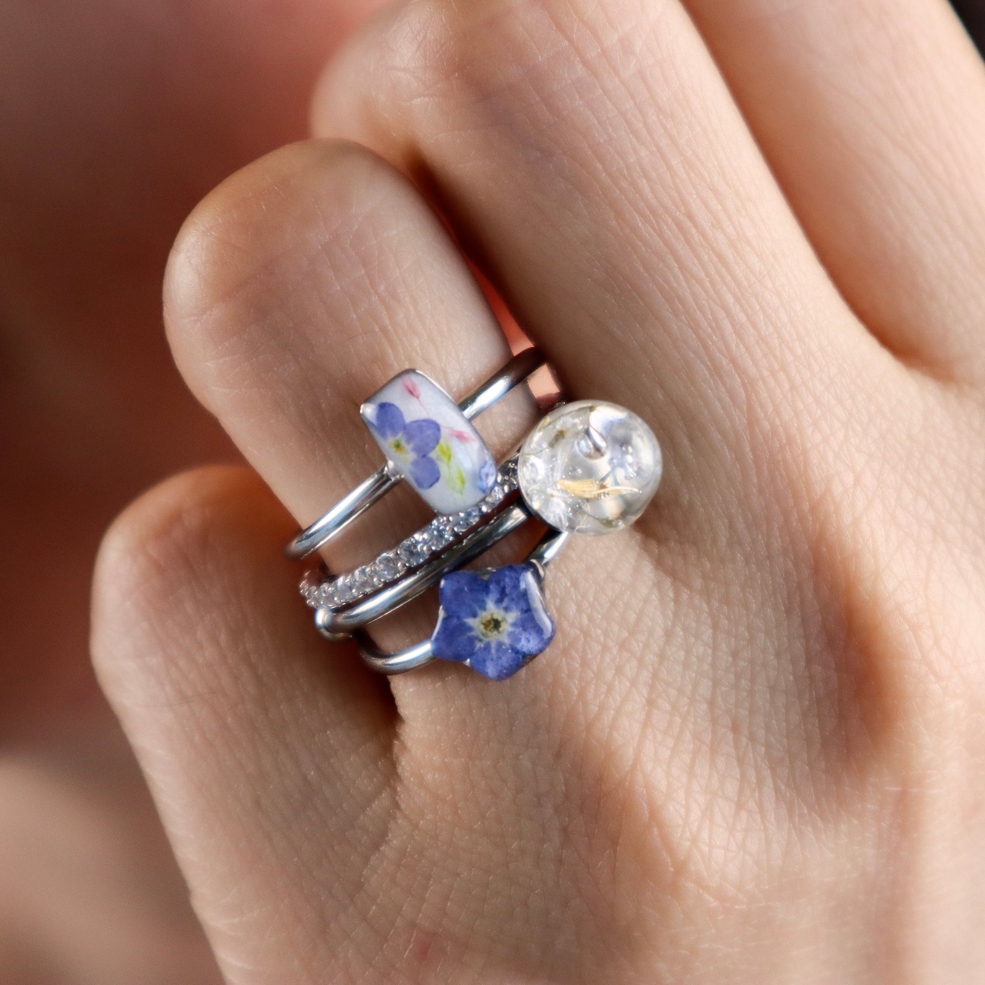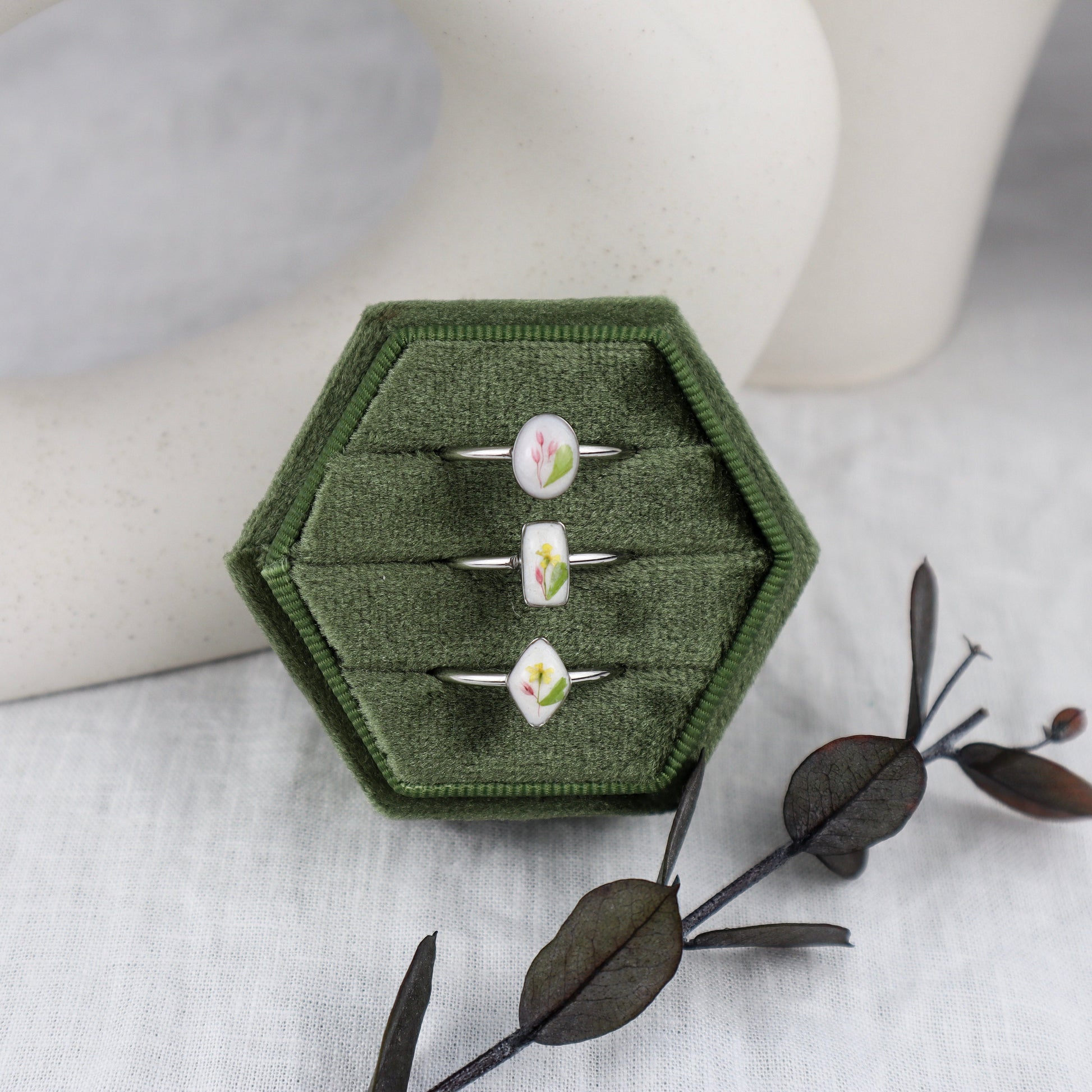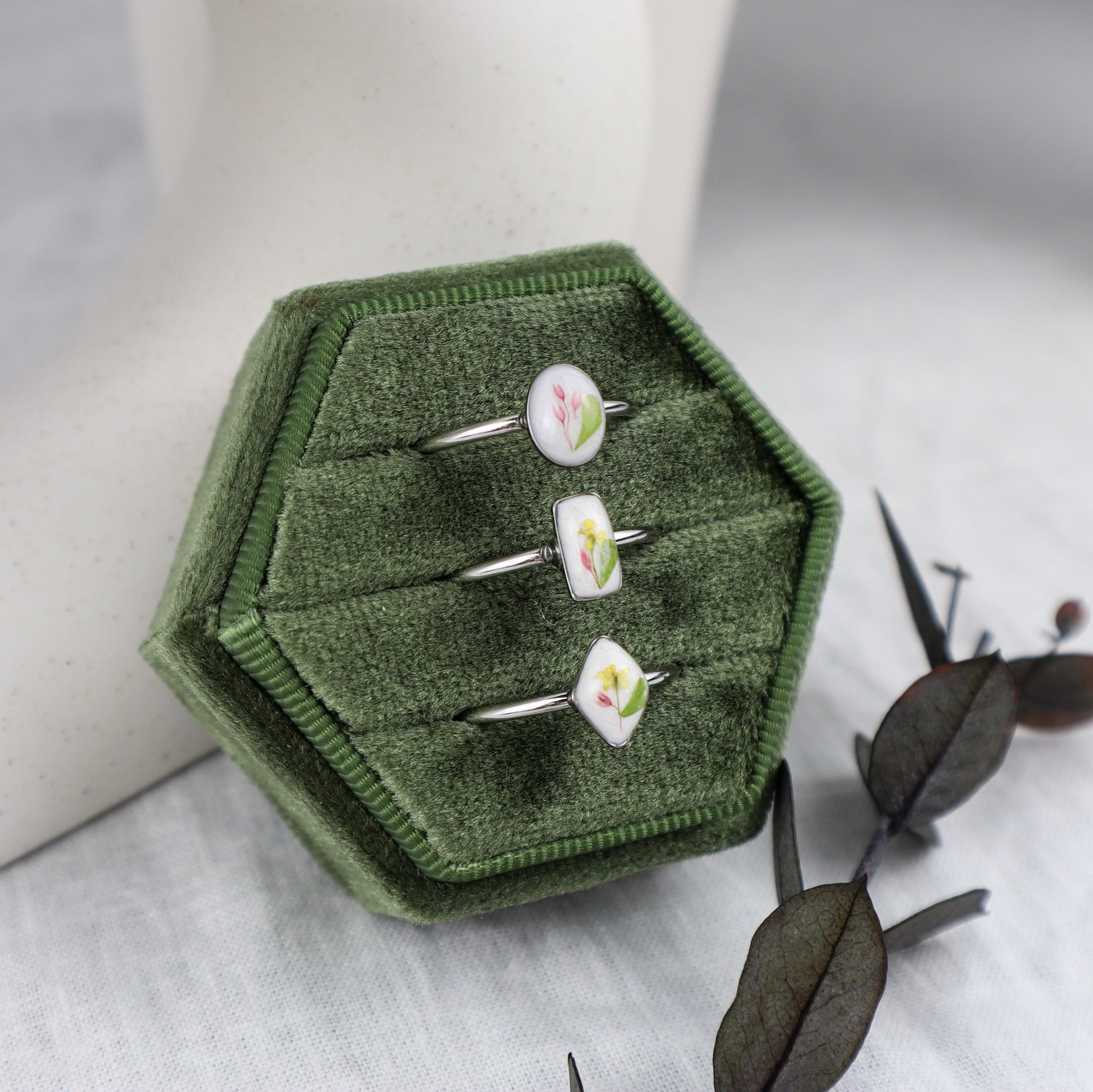 These adjustable rings are crafted in three elegant shapes, featuring a single lace flower delicately placed inside with matching pink or green leaf details. The background color is created using mica powder for a soft, luxurious glow.